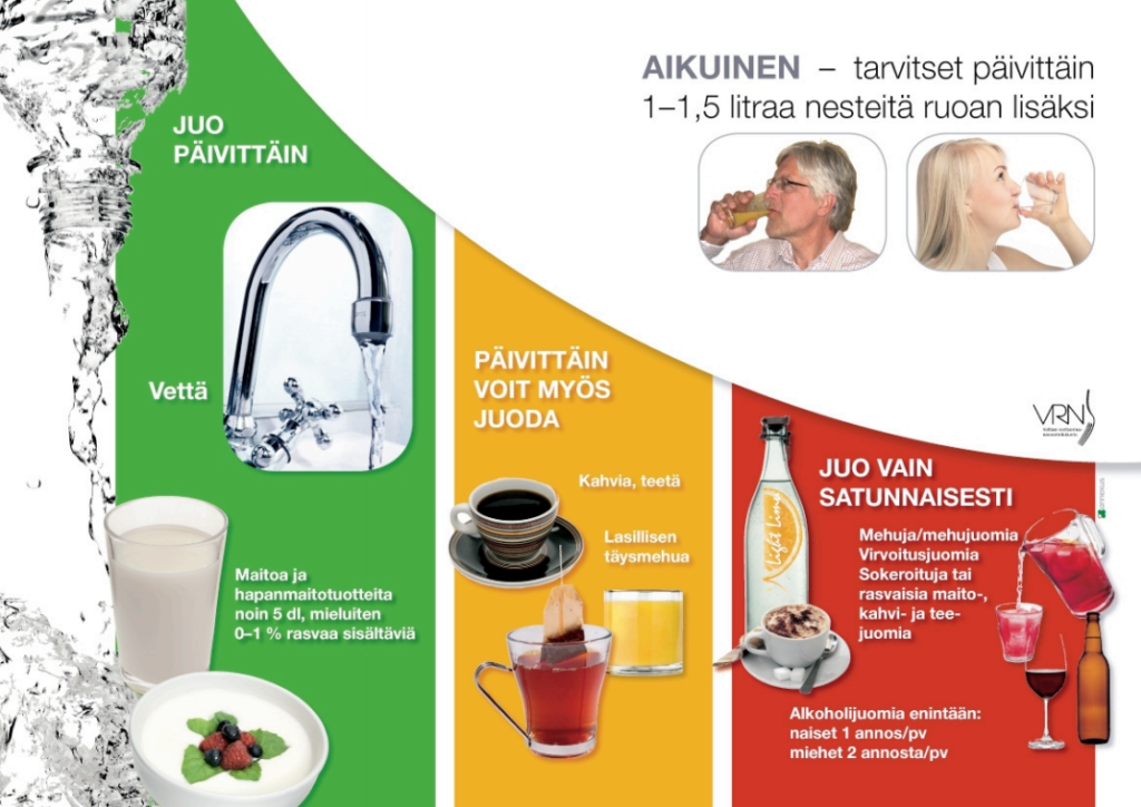 Nesteen tarve on yksilöllistä. Siihen vaikuttavat esimerkiksi fyysinen aktiivisuus, ympäristön lämpötila ja ikä. Useimmilla nesteen tarve tulee tyydytetyksi, jos juodaan janon mukaisesti. Aina jano ei toimi nesteen tarpeen mittarina. Päivittäinen suositeltava nesteen määrä on 1–1,5 litraa ruoan sisältämän nesteen lisäksi. Ruokajuomaksi suositellaan vettä, kivennäisvettä, enintään 1 % rasvaa sisältävää maitoa tai piimää. Vesi on paras janojuoma. Sokeroituja juomia ei tule käyttää säännöllisesti, sillä sokerilla makeutettujen juomien käyttö on yhteydessä tyypin 2 diabeteksen riskiin ja ylipainoon sekä hampaiden reikiintymiseen.